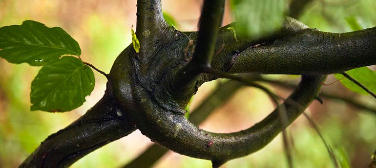 The road is lined with beech trees, and many of them have their branches twisted into knots. Some have been growing into that shape for so long that the strands of the knot have grafted together and become a permanent part of the tree’s shape.