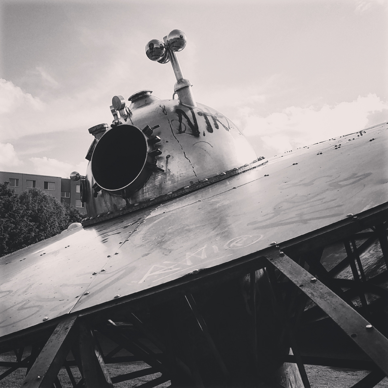 Famous SNP bridge is not the only UFO in Bratislava. Bieloruská street has shape of a circle and near center of the circle (in the park) is 4.6 meters tall iron statue UFO (flying saucer) by sculptor Juraj Hovorka in the seventies. It once served as an attraction for children, later it was dangerous wreck and from 2014 it is newly repaired. Circles are for this area very typical: Medzi Jarkami prefabricated housing estate consists of 4 circles, paths are circular, Ružinov cemetery (alias Vrakuňa) has graves arranged in couple of dozen circles …